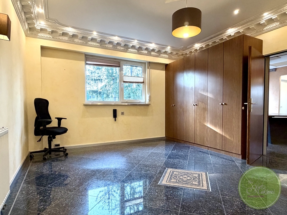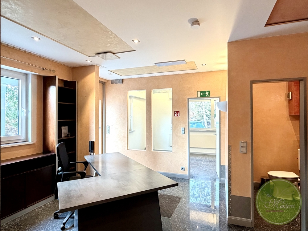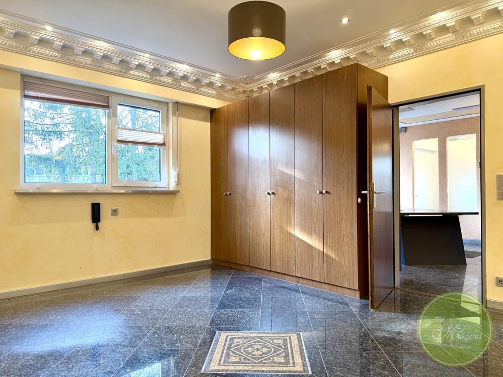 Rechter Hand, das Büro 3, ein klassisches “Chefbüro” mit viel Echtstuck, Einbauschränken und standesgemäßer Klimaanlage. Sollten Sie eine Praxis hier führen wollen, so wäre das gerade im Sommer ein sehr angenehmer Therapieraum oder ähnliches.